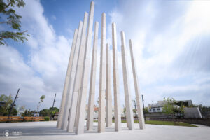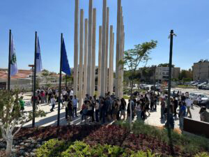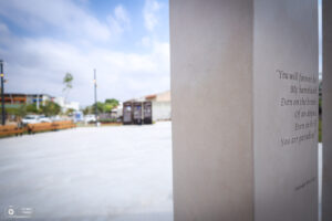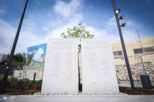 בכניסה לגן ניצבת אנדרטת "עמודי הנצח", במקום בו עמד בניין תחנת המשטרה. 18 העמודים נישאים אל השמיים במקבץ מאוחד שבמרכזו חלל ריק. העמודים מסמלים את העמידה האיתנה, את הערבות ההדדית של קהילת העיר שדרות, ואת החלל שנפער בה עם נופלם של בניה, בנותיה ומגיניה. על גבי העמודים נחרטו אותיות, פסוקים וציטטות בהשראת הביטוי "גווילין נשרפים ואותיות פורחות" מתוך תלמוד בבלי, עבודה זרה דף י"ח. האותיות המופיעות על העמודים הפנימיים יוצרות יחד את המשפט – עם ישראל חי. את האנדרטה מלווה פסקול מקורי של היוצרים המקומיים חיים אוליאל ורן אלמליח. האנדרטה נחנכה ביום השנה לטבח, ה-7 באוקטובר 2024, בטקס במעמד נשיא המדינה יצחק הרצוג, ראש העיר אלון דוידי, רב העיר דרור טוויל ומפקד מחוז הדרום של משטרת ישראל אמיר כהן.